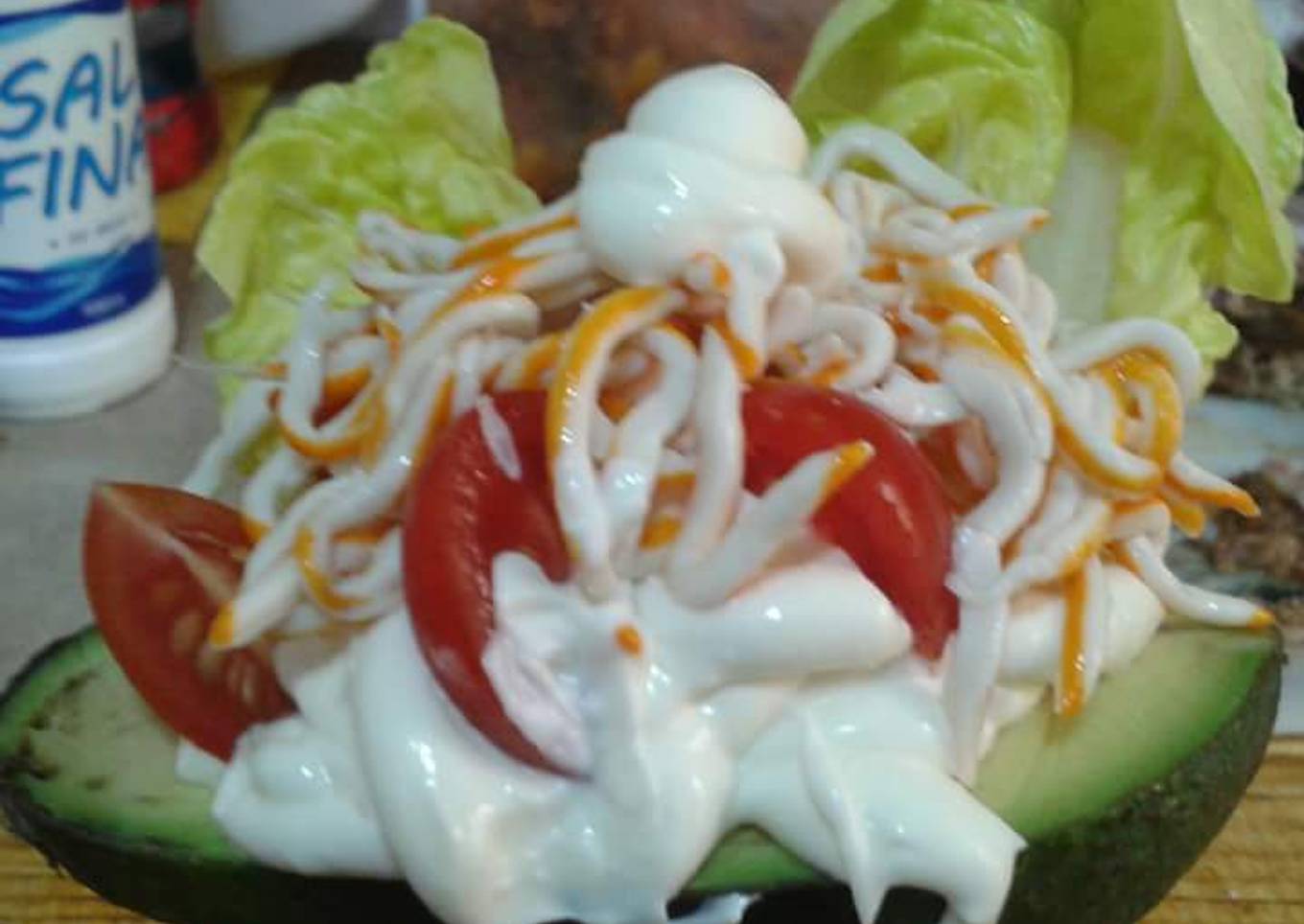 - En bol atún sal cebolla y pimiento picadito gambas y surimi picado mayonesa o salsa rosa aguacate sobrante