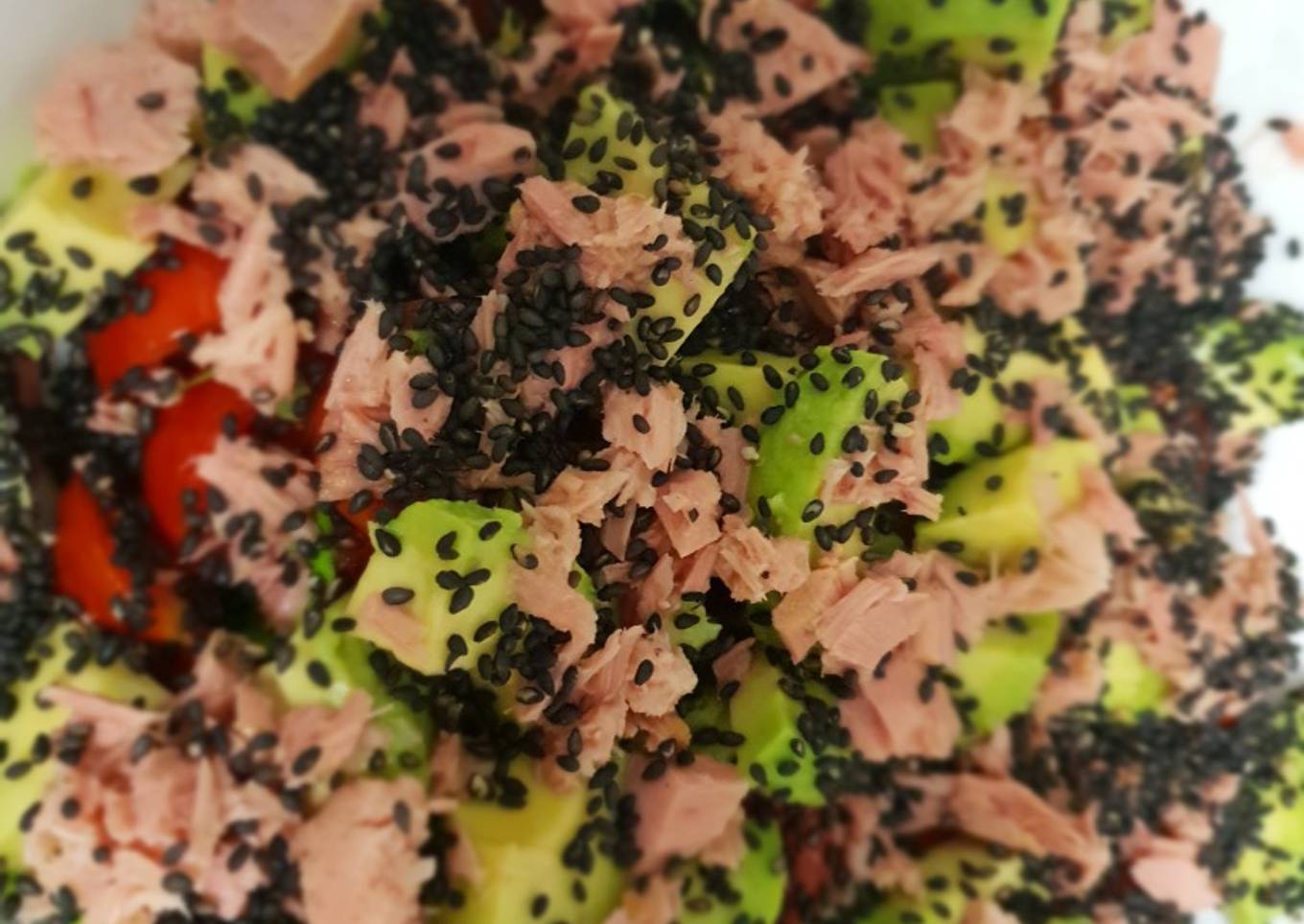 Ensalada de tomates cherry y aguacates con semillas de sésamo negro y albahaca