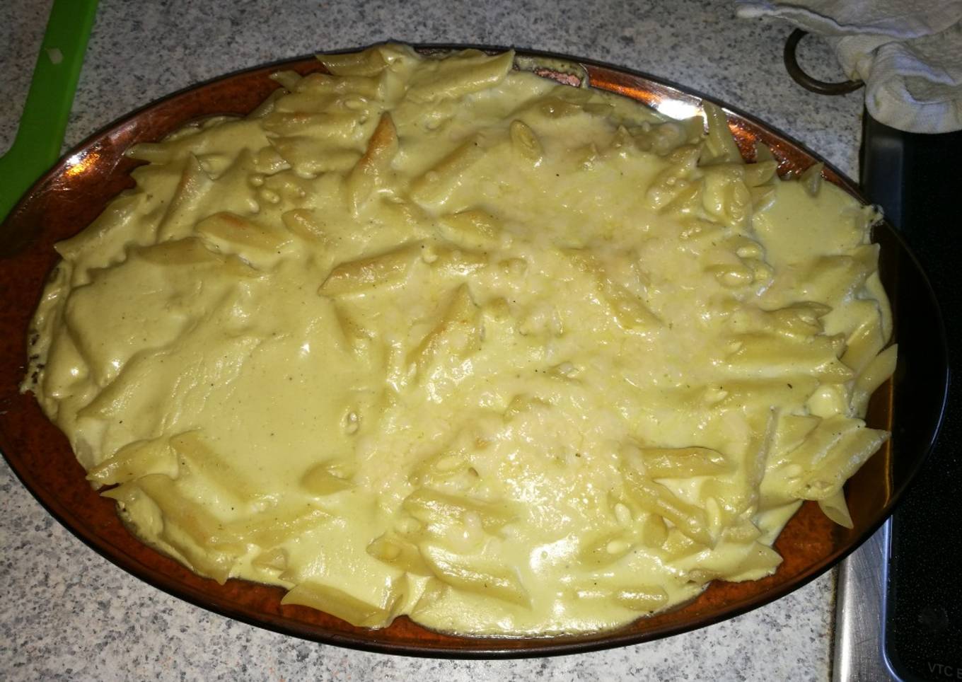 - Mientras tanto, se calienta el horno a 180 grados. Transcurridos unos quince minutos hirviendo la salsa, se bate y se pasa por un colador, vertiéndola sobre los macarrones. Se añade el queso parmesano rallado y se introduce en el horno pre calentado a la temperatura citada.