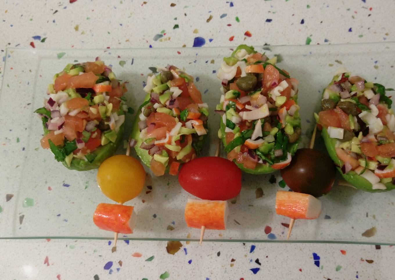 - Cortamos algunos palitos de surimi a tacos y los pinchamos en un palillo de diente con un tomatito y a comerlos con los aguacates y a disfrutar que este plato está muy rico y es muy sano.