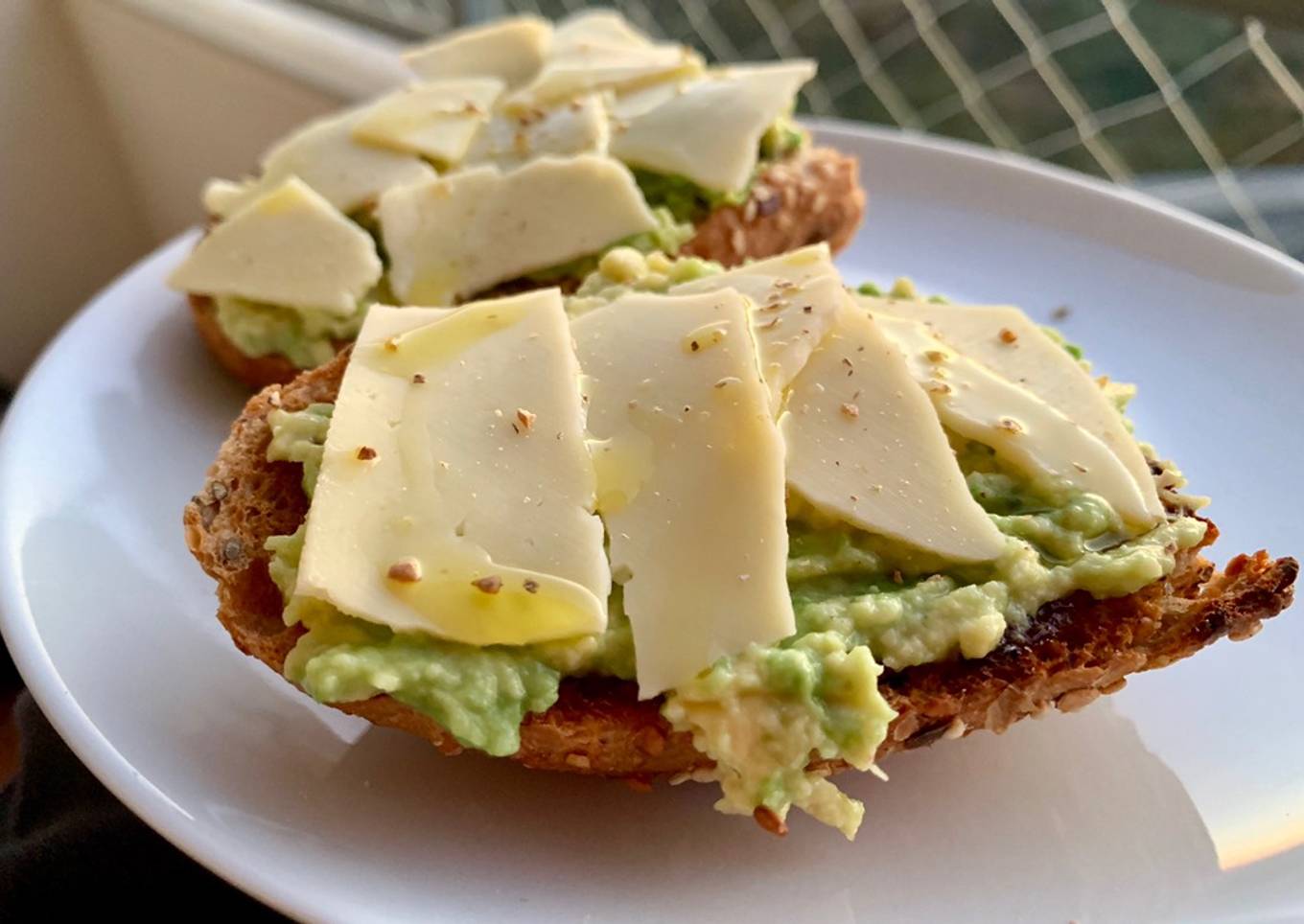 - Poner el aguacate chafado sobre la tostada. Añadir el queso a trozos. Poner un poco de aceite y pimienta blanca recién molida