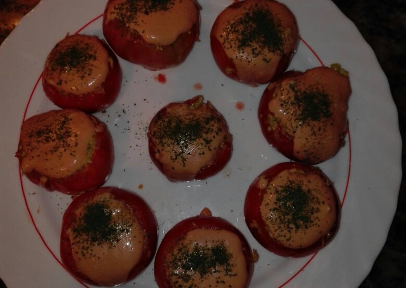 - Voy reyenando los tomates y una vez rellenos le echamos por encima una cucharada de la salsa que hemos echo un pellizco de perejil para adornar y a comer
