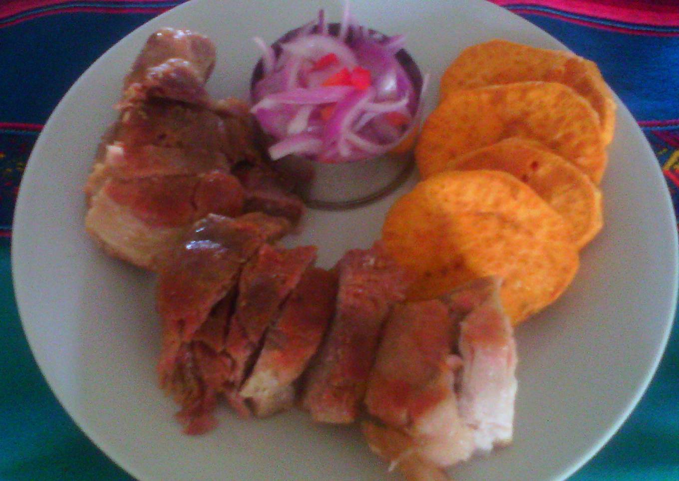 - Dejar que el agua se consuma completamente y que el chancho se fría en su propia grasa. Acompañar con camote y salsa criolla.