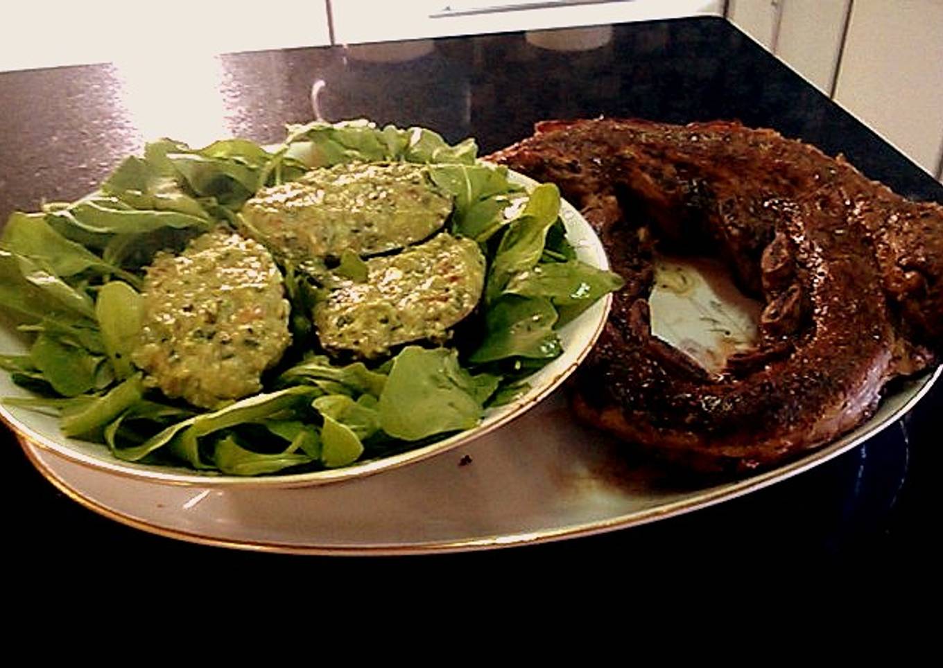 - No me olvidé falta, el tiempo total a horno bajo es 170°C, pero a mitad de cocción lo pincelamos nuevamente muy bien , con bastante salsa y llevamos a la parrilla o fuego de arriba, para que le de ese color bronceado caribe, que conseguimos con la salsa. esperamos 15' y retiramos, damos vuelta y pincelamos bien del otro lado, para que el sabor y color quede parejo. como este lado está cocido, pero no tuvo mucho fuego directo, subimos el fuego a 190°C por los minutos restantes. Y retiramos, dejamos reposar unos minutos y servimos acompañados con el guacamole, que pusimos en su cazo (el de su palta o aguacate, sobre una ricas verduras de hoja verde, en este caso rúcula al natural, me encanta, bañalas con el guacamole, les da el aliño justo. Y buen Provecho, quedó muy sabroso!!!
