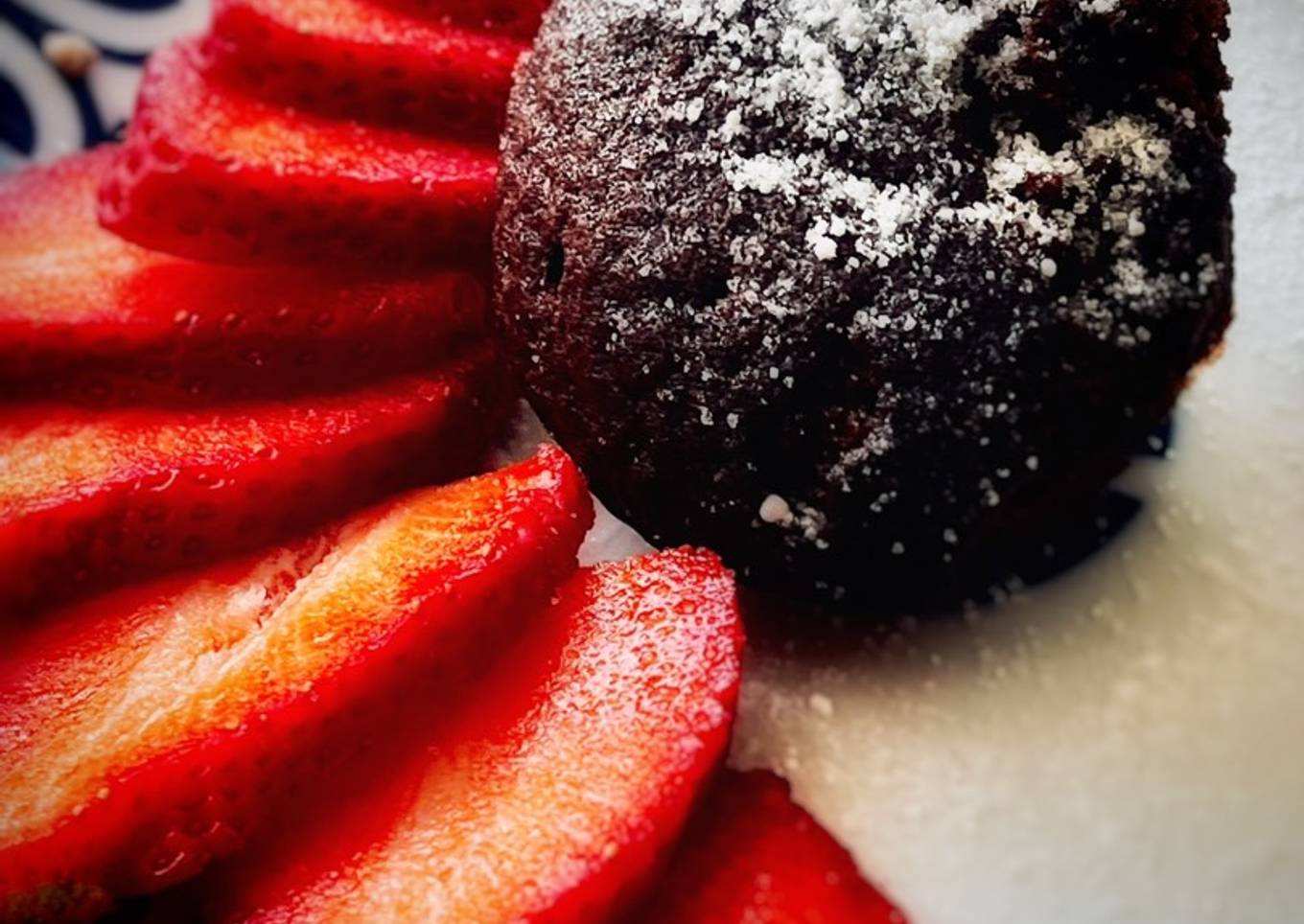 - Decoramos con azúcar glass, y acompañamos con fresas laminadas y bombones de melocotón con brandy.