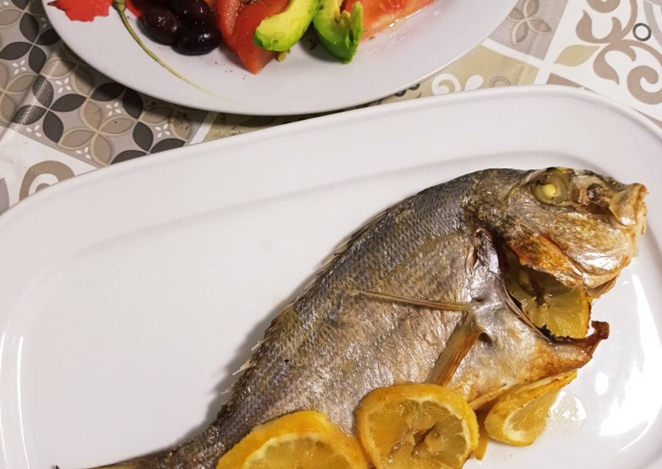 La cena del sábado. Dorada al horno con zumo de limón y ajos laminados. Para acompañar una sencilla ensalada de tomates y aguacate con olivas y guindilla picante.