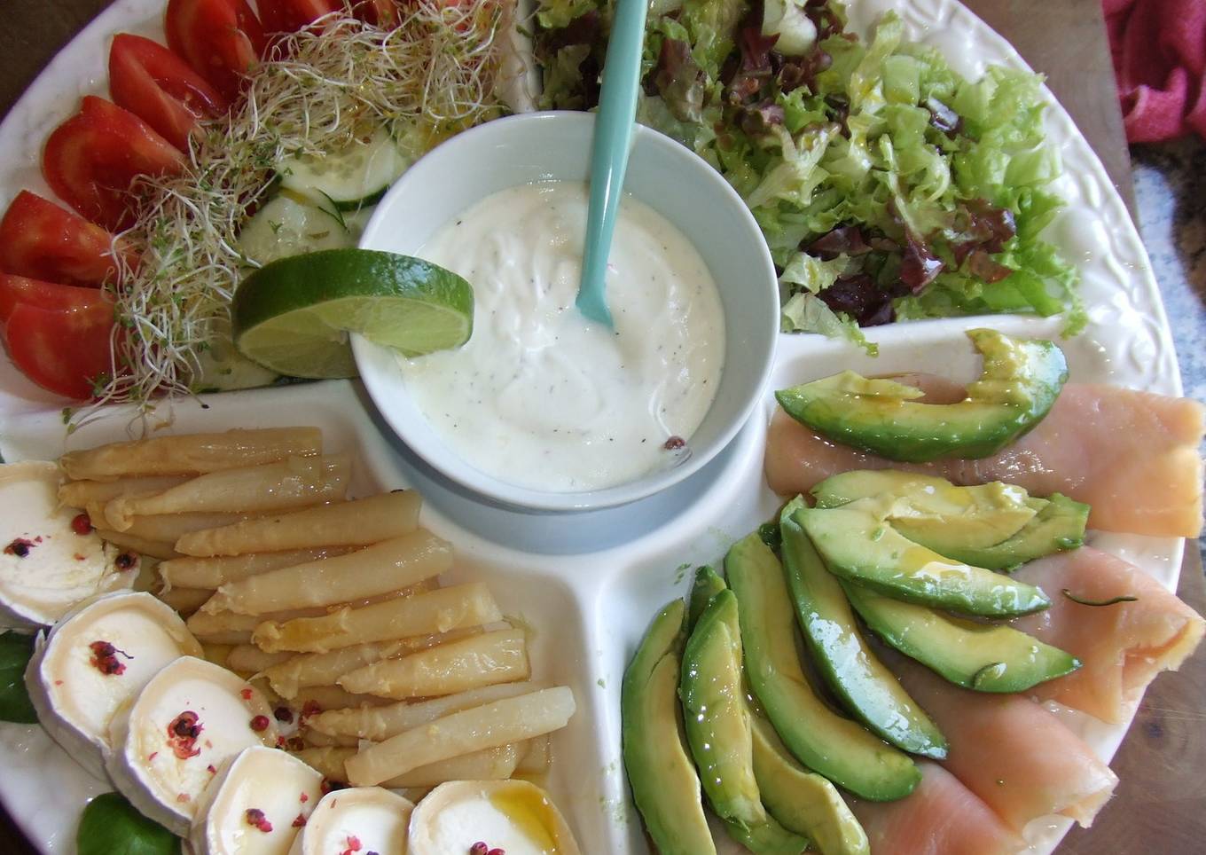 Ensalada de salmón con aguacate, brotes de alfalfa y salsa de yogur
