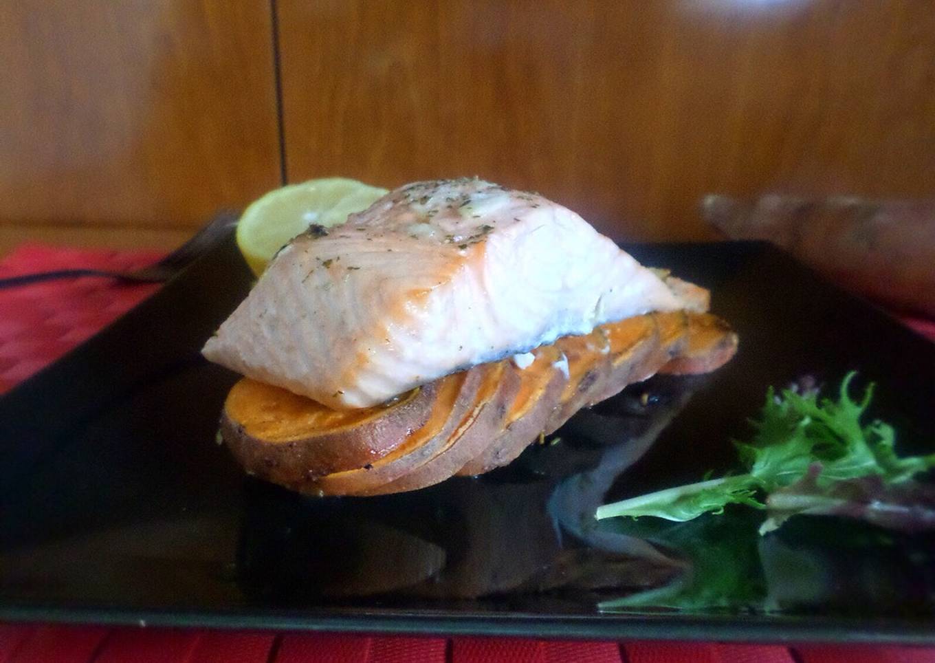 - Coloco el salmón sobre el boniato; bajo la T° del horno a 180ºC y meto unos 20min hasta ver el salmón hecho a nuestro gusto.