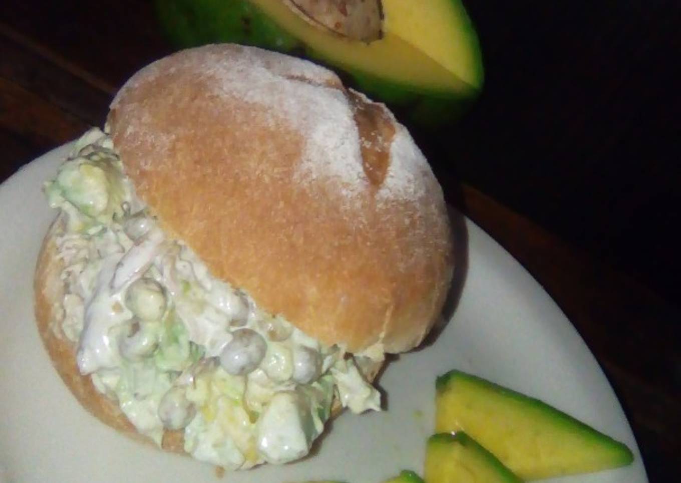 - Cortamos el aguacate en cubos, le agregamos el pollo desmechado, los guisantes, cilantro finamente picado y la mayonesa casera, rectificamos de sal y rellenamos los panes....