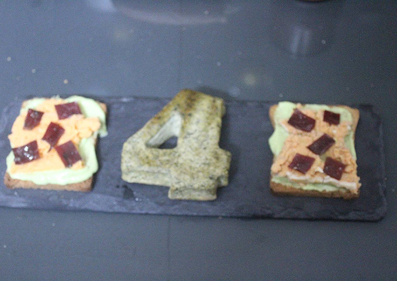 En esta receta os traigo algo muy diferente, donde os uno una tortilla de algas con forma de número y dos tostadas untadas con mayonesa de aguacate, cubiertas de pastel de cabracho y decoradas con trocitos de cecina (jamón de vaca).